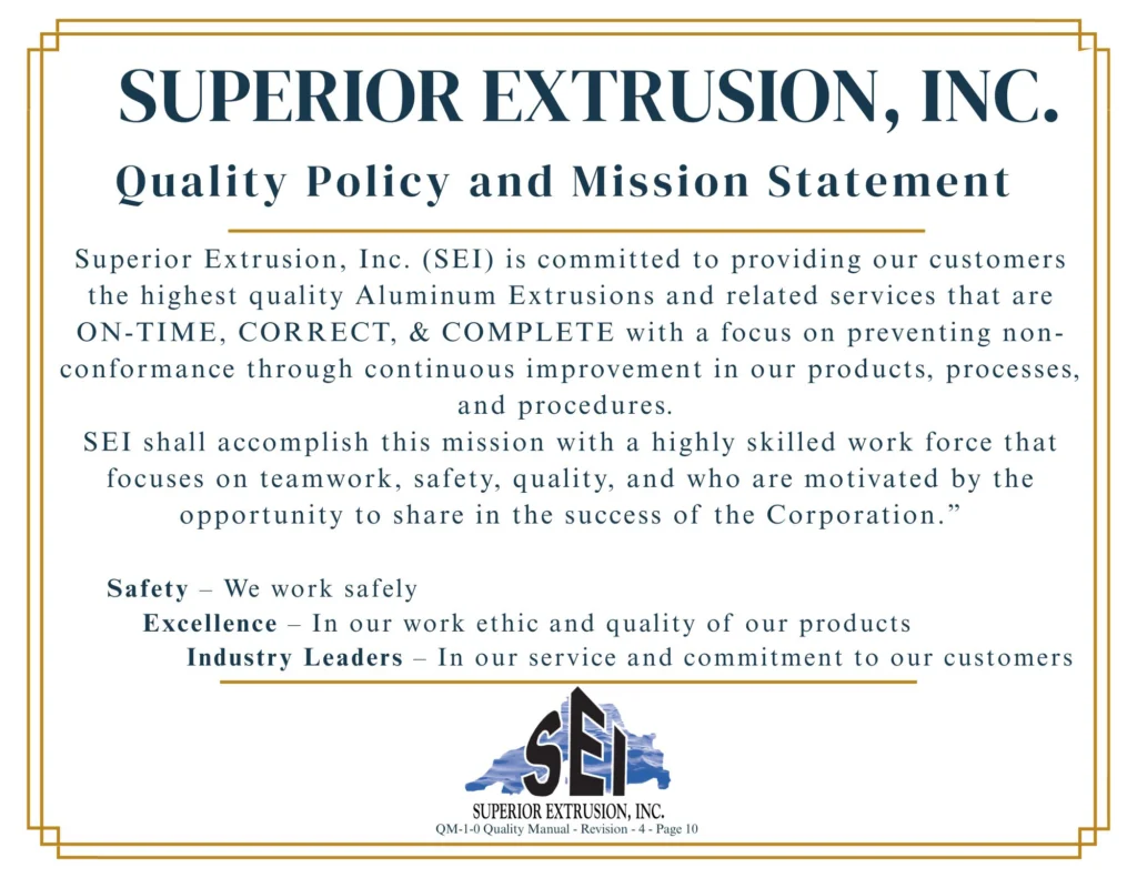 Superior Extrusion, Inc. (SEI) is committed to providing our customers the highest quality Aluminum Extrusions and related services that are ON-TIME, CORRECT, & COMPLETE with a focus on preventing non-conformance through continuous improvement in our products, processes, and procedures.